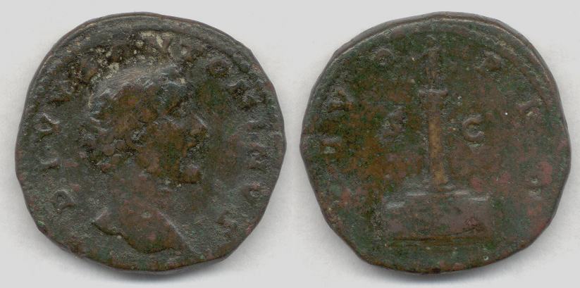 25. Picture Antoninus Pius (138-161). AE Sestertius (commemorative). Bare head right / Column with statue on top. DIVO PIO S C. Nice, well-centered, but worn coin. A touch nicer than the scan makes it look. Field has some smoothing apparent. Inscription all readable. (S1306) F. $90 REDUCED TO $60! SOLD