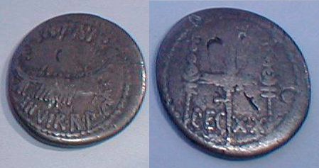 29. Picture Mark Antony (c. 32BC). AR Denarius. Galley right / Legionary eagle between two standards. Legion VI? (S414A?) aF/VG, obverse slightly off-center to right, noticeable scratch on reverse, which is quite off-center. Legionary number mostly readable but weak to right, hence slight uncertainty about VI. Still another inexpensive chance to own one of these historic coins. $25 SOLD