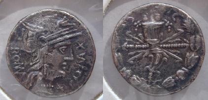 57. Picture Q. Fabius Maximus (127BC). AR Denarius. Helmeted bust of Roma right / Cornucopia on thunderbolt, in wreath. (S216) aVF, somewhat pitted, reverse slightly off-center. $55 SOLD
