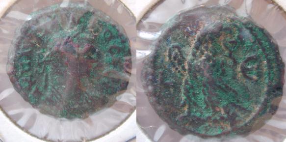 7. Picture AE As. This is a quite worn Janus / Prow type. Weighs approximately 21g. Condition is close to VG with some corrosion or deposits. The right face of Janus is pretty distinct, but the left is a little hard to see. Obverse is off-center a bit to right, but face is not off the coin. Reverse is well centered and outline of prow is pretty clear. I think I can see ROMA underneath, but I could be imagining it. From the weight, I think this is ca. 150 BC, but I don't know this type well. $25 REDUCED TO $20