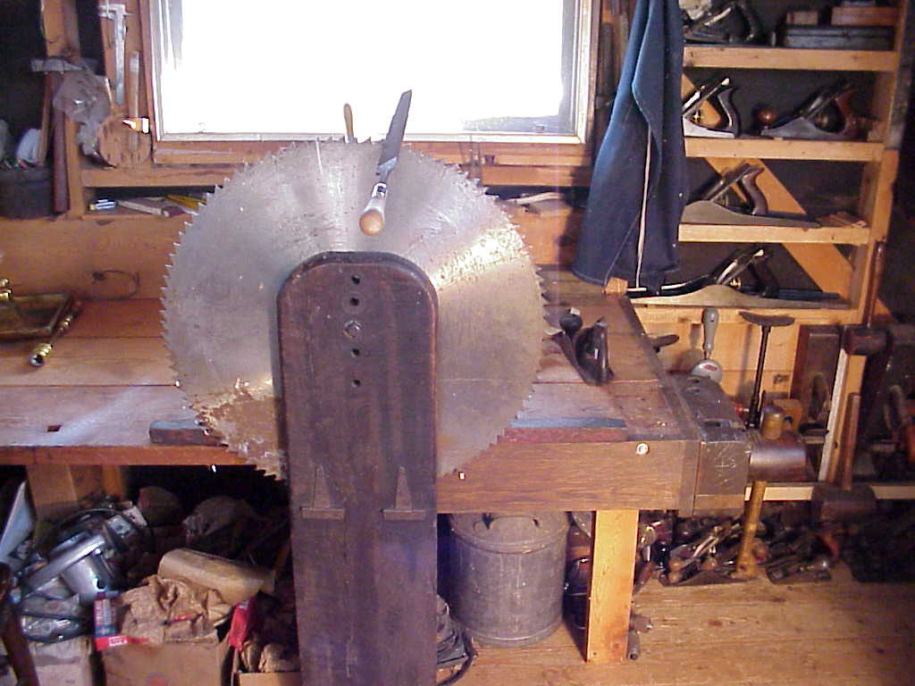 Pole saw blades are commonly used as cut off saws on green wood, hence the name pole saw. One is cutting long poles of green wood. Making stove wood or chord wood is the main use of this type of saw. These blades are in the range of two feet in diameter and have teeth set alternately a wide set is used causing a wide kerf to avoid hard cutting in green wood. The blade first must be jointed to get the blade round, this can be done by locking the movable saw table and with the saw running lightly touch the saw teeth with an old whet stone or a brick moving the stone laterally side ways. The reason for the lateral movement is to avoid creating a groove in the stone, which will not work. Once the blade is round one can sharpen on the saw buck or make a saw clamp as in the image for sharpening indoors. File the teeth, following the prior shape, if the gullets need more depth do with a round file. File the tops of the teeth from one side keeping the angles uniform. Chalk the file to avoid clogging of the file teeth. Once both sides are filed you are ready to set the teeth. Set the teeth on an iron block or anvil edge with a rounded edge using a hammer. Set the tip of the tooth about the top third or quarter.