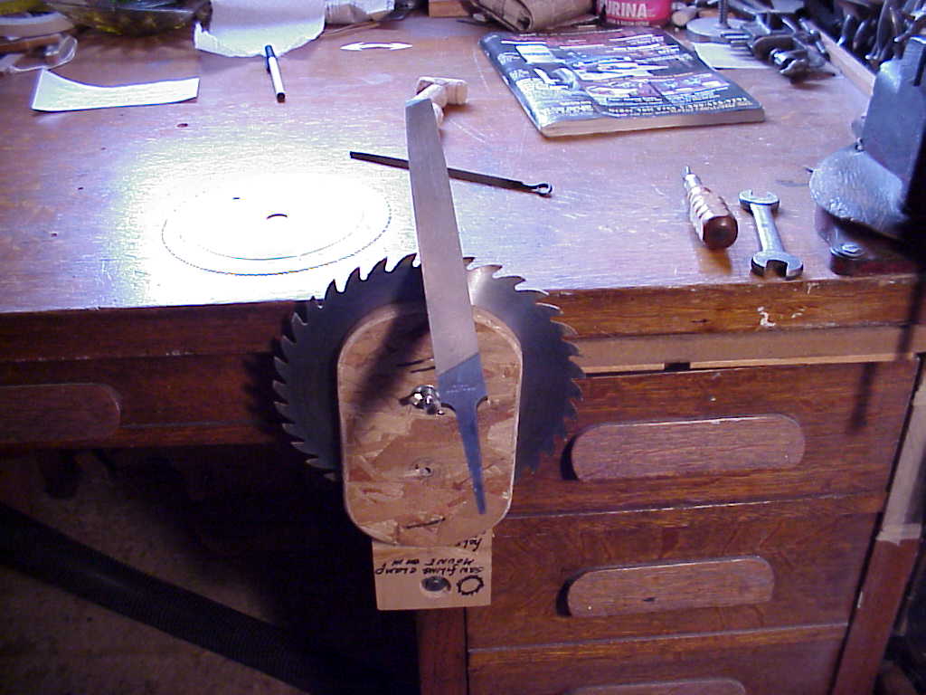Blade filing fixture is easy to make and will save you time. Put a series of holes for different size blades. Mount the blade filing fixture to a solid bench so that when filing the file does not chatter.