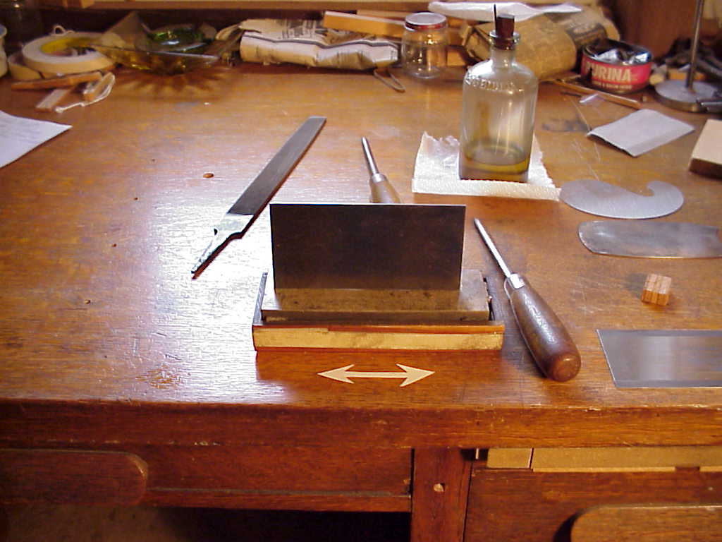 Whet the scraper edge. Put some kerosene,scented lamp oil if you don't like the smell of kerosene on the whetstone. Whet the scraper in the direction of the arrow until the corners are sharp. Take the scraper and break/dull the four 90 degree corners of the scraper to avoid digging in and damaging your work.
