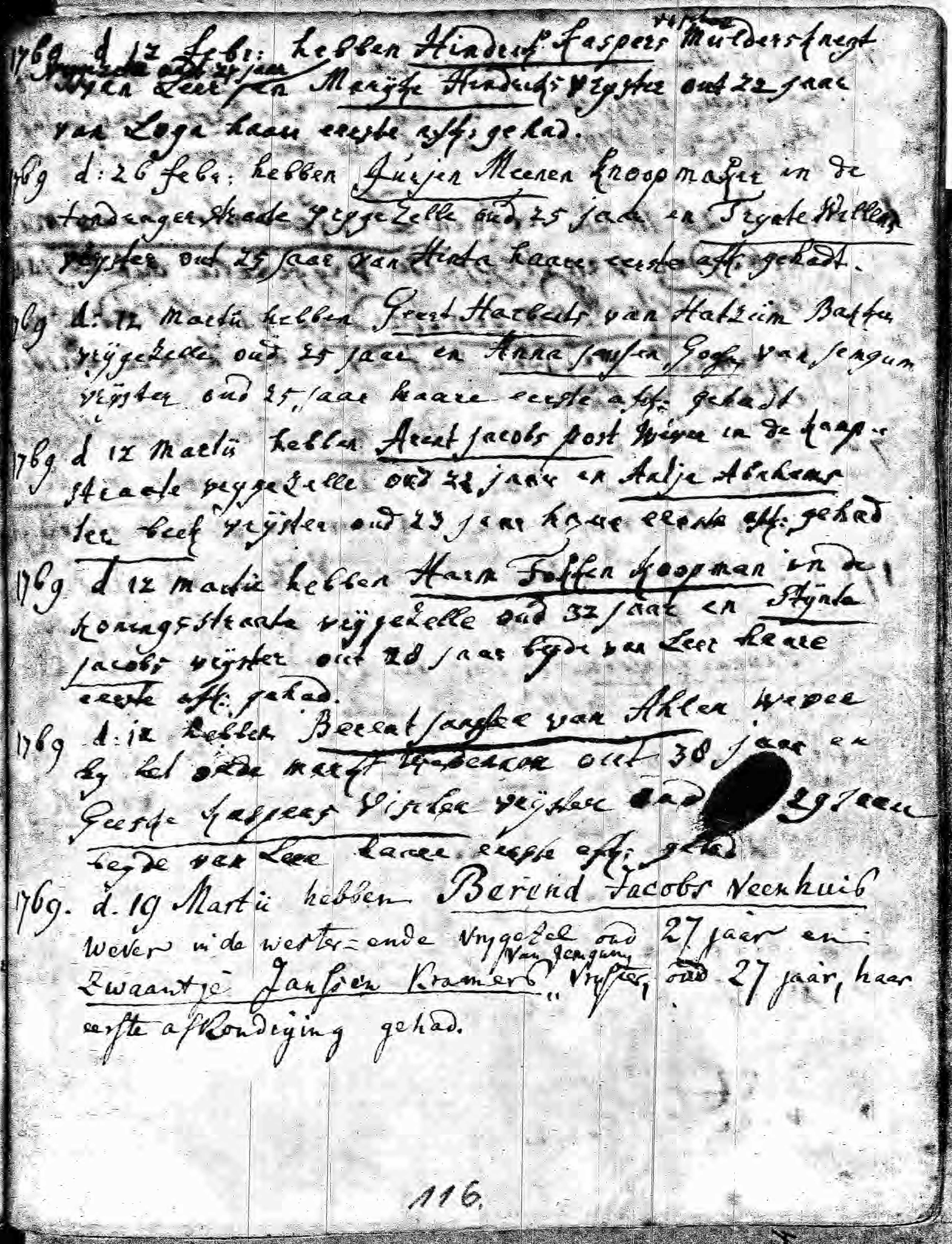 Arend Jacobs Post." Reading the actual scan I am reading the month as Martii. This is Latin for MARCH making this marriage date 12 March 1769! NOT 12 Feb 1769. Image.