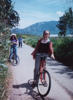 My wonderful Oregon-residing friend Shannon ( whom I met here, at our hotel ), me, and Shannon's mom Jan biking along a beautiful street. |