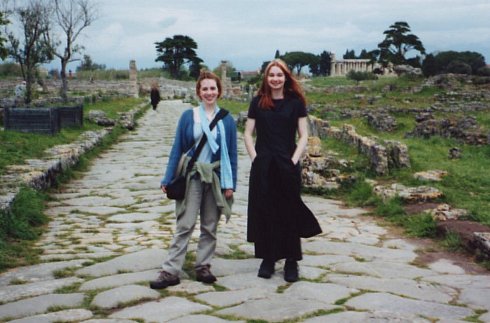Shannon and I on a sacred road in the Greek city. Ancient indentations made by horse-drawn carriages could be seen in the stones. |