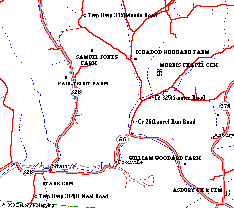 This map shows the location of the farms for the Woodard,Jones and Taylor families.It also shows the location of the cemeteries that they're buried in.