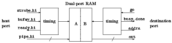 The circular-buffer block is a much larger memory block (32 Mbyte) used to capture data from five data streams. This memory block is configured to continuously acquire data from these five channels, wrapping at the end of the memory – this to provide high-resolution data both before and after critical events.