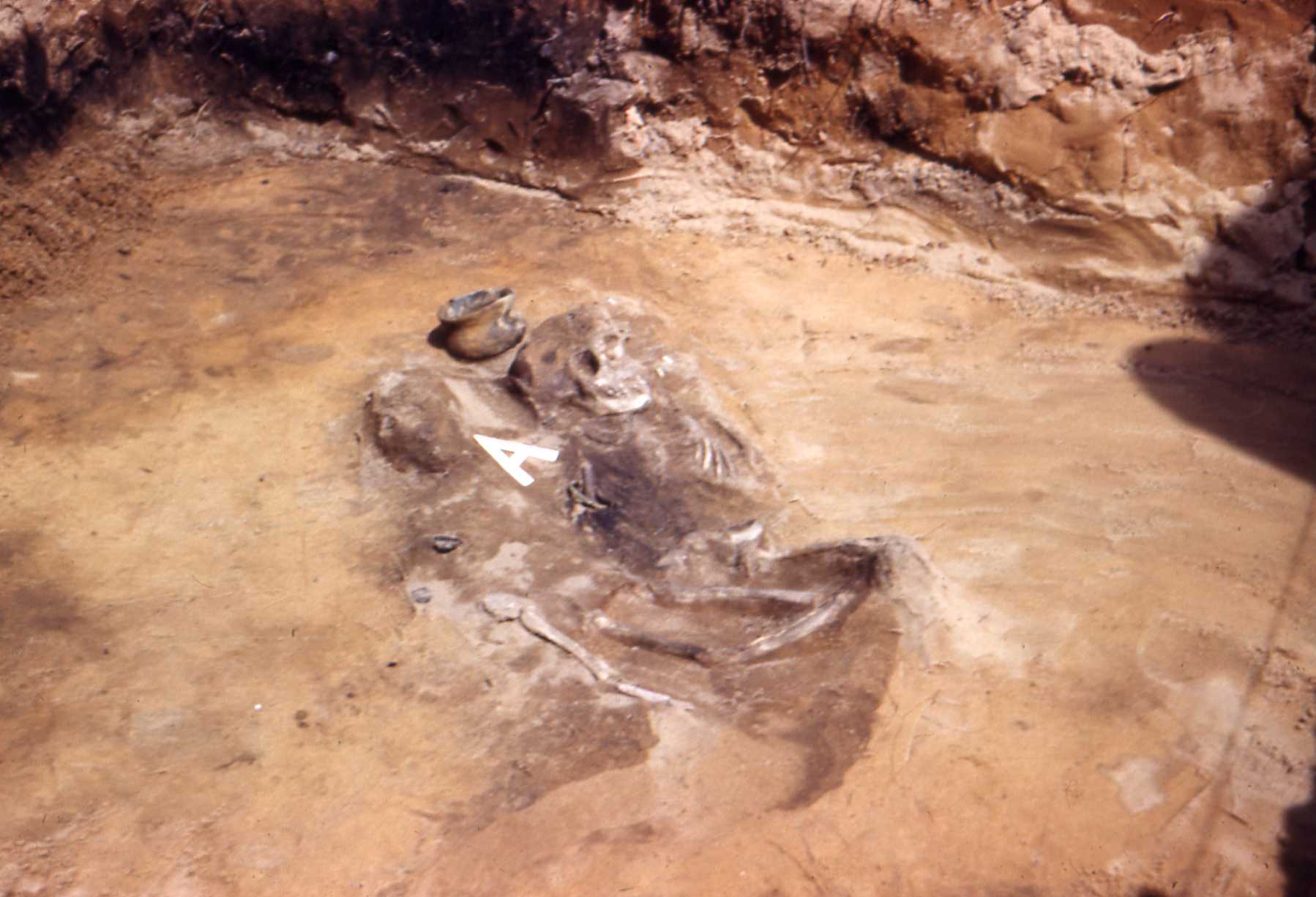 Riverside site childs burial with vessel,bone harpoon,oriented North,depth 3feet below present surface.