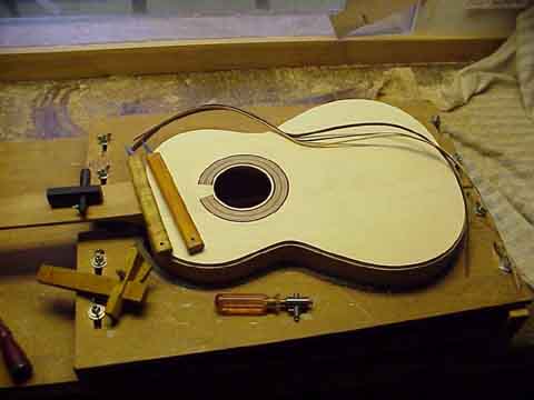 Another way to hold the guitar when banding. The guitar neck is clamped in an upright