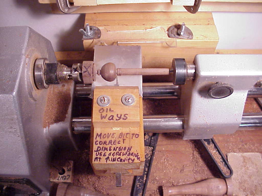 Turning fixture used against a pattern of plexiglass to create a duplicator. One can turn pegs freehand but this fixture will give better accuracy when turning many pegs. The fixture slides laterally on the ways of the lathe and has a wooden sliding tool rest that is operated by hand as is the sideways motion. Oil the ways and sliding tool rest dovetail. The cutting tool is made of an old metal lathe bit, ground as in the image to cut in both directions. The metal stylus that rides on the template can be made of iron and the tip polished, in order to not wear the plexiglass. Any shape peg for guitars,lutes, violins etc. can be turned using this system as well as many other things. The cutting bit is whetted on the top and given a slight whetting on the side. Hard maple is a good wood to make this fixture out of.
