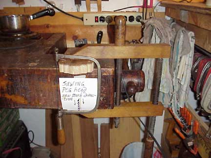 Sawing the peghead crest with a coping saw note tooth direction in image.