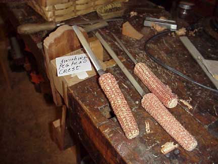 Finishing the peghead crest (corncobs make good file and rasp handles)