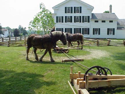Matt Harvey of Campbellsport, Wisconsin,U.S.A. Restored a horse powered drag saw having only the iron components and some badly decayed remnants of the wooden frame. The restoration involved about a month and a half of spare time work. The timber frame was sawed on his saw mill that he also built. The horses in the image are Matt's , they are the same ones used to pull the logs out of my woods as shown in the wood getting section of my guitar construction site. In the future he will power the drag saw with oxen he is raising. The oxen have grown to full size and he will soon make a full sized yoke for them. He made smaller sized yokes for them to start their training early. There is no date on any of the iron components. I would give an estimated date for the drag saw of circa 1900.