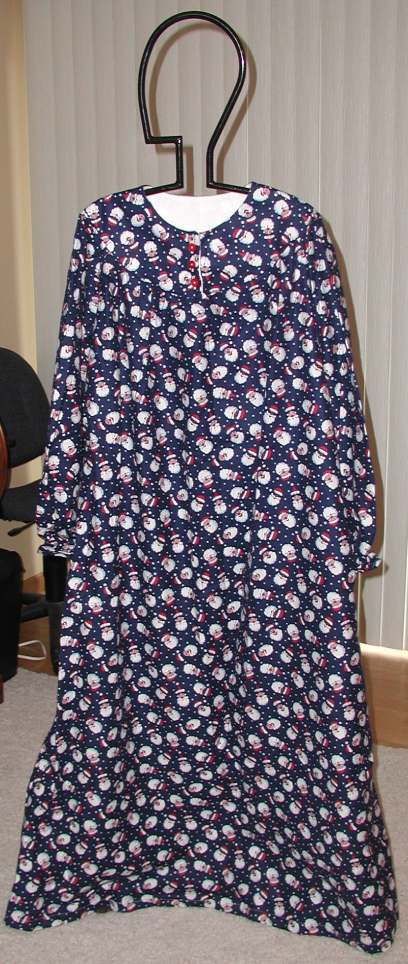 Cozy, warm nightgown in size large. These have been a favorite family gift for many years. Unlike their store-bought cousins, these flannel nightgowns are made from durable flannel. They'll be your warmest winter friend for many seasons. 3-Button neck, elastic wrists. Add a book, a cozy chair, and a hot cup of cocoa, and you'll start looking forward to winter again. Machine-washable. Click on the icons to see a larger picture.