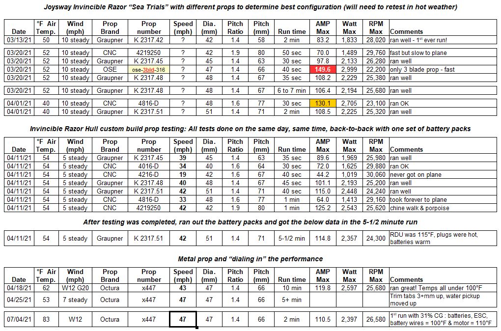 After I fixed the motor mount and stuffing tube mount, we were able to run the following weekend and test several props (see the chart below). We also got to run it in high winds and "rough seas" the same weekend. As you will see in the second video below, when it wiped out in the high winds from the bad driving (waves + wind + turning into the wind while accelerating = flip-and-roll), the ESC mount came off. But the motor mount stayed in place! LESSON LEARNED: Surface prep is key (sand the 2 surfaces to be bonded with 80 grit sandpaper to give the epoxy something to physically grab onto). Plus, really good epoxy certainly helps! Now to see if the battery trays and servo tray mounts will eventually fail. I tried to pry them off but they wouldn't give, so maybe they'll stay in place.