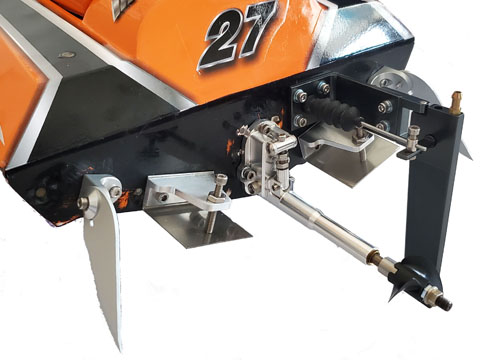 After the "sea trials" and prop tests were completed, and primarily after selecting a final prop, there were some handling issues. Initially the boat was running "wet" where there was a lot of hull in the water. At full throttle on calm water, the water was breaking off the hull at about the mid-point instead of near the stern. After playing with strut/stinger angles and trim tab adjustments, I finally had to modify the trim tabs to get them further up the transom. I can now move the trim tabs from flush with the bottom of the keel/hull up to about 3mm above flush. That helped dramatically and I saw performance improvements.