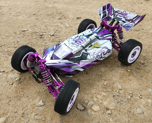 A 1/12 scale 4WD WLToys 124019 with brushed motor (shown with all the OPTIONAL purple aluminum upgrade parts)