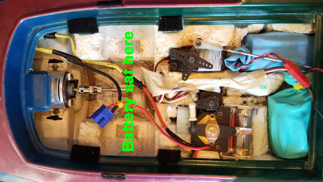 The first image below is the original R/C setup from 1994 - 2020 with a "mechanical" speed control with a separate resistor I had to put behind the rear seat (it's shown pulled out of its original mounted location in the stern). It also had a 4 AA battery pack for the servos.