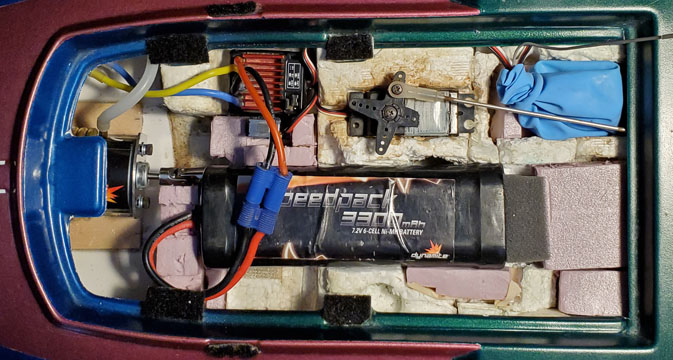 I updated and upgraded the boat in 2019 with the Hobbywing QuicRun WP-1060 (60-amp brushed) electronic speed control; a Dynamite 20-turn 540 brushed motor and a Flysky receiver to work with my Flysky FS-GT5 transmitter.
