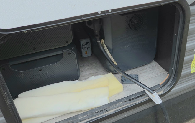 In the new travel trailer camper, it goes in the front storage compartment which also makes it easy to plug the roof-top solar panels into it for on-the-road charging (more on this below).