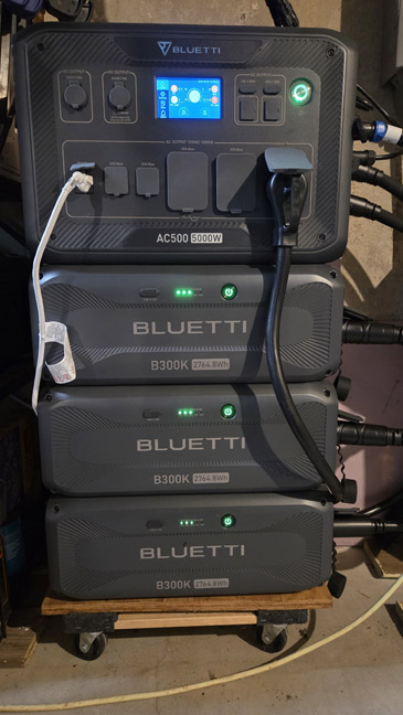 This setup got us, on paper, 8.3kWh of battery (3 B300k batteries at 2764.8Wh each, the AC500 does not have a built-in battery). Assume 80% efficiency, which is a little low I think, and you get about 6.6kWh of usable battery backup.