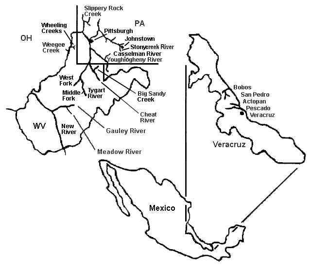 Actopan River, Veracruz, Mexico Big Sandy Creek, WV Bobos and San Pedro Rivers, Veracruz, Mexico Casselman River, PA Meadow River, WV New River, WV Gauley River, WV Cheat River, WV Pescado River, Veracruz, Mexico Slippery Rock Creek, PA Stonycreek River, PA Tygart River, WV Weegee Creek, OH Wheeling Creeks, WV Youghiogheny River, PA