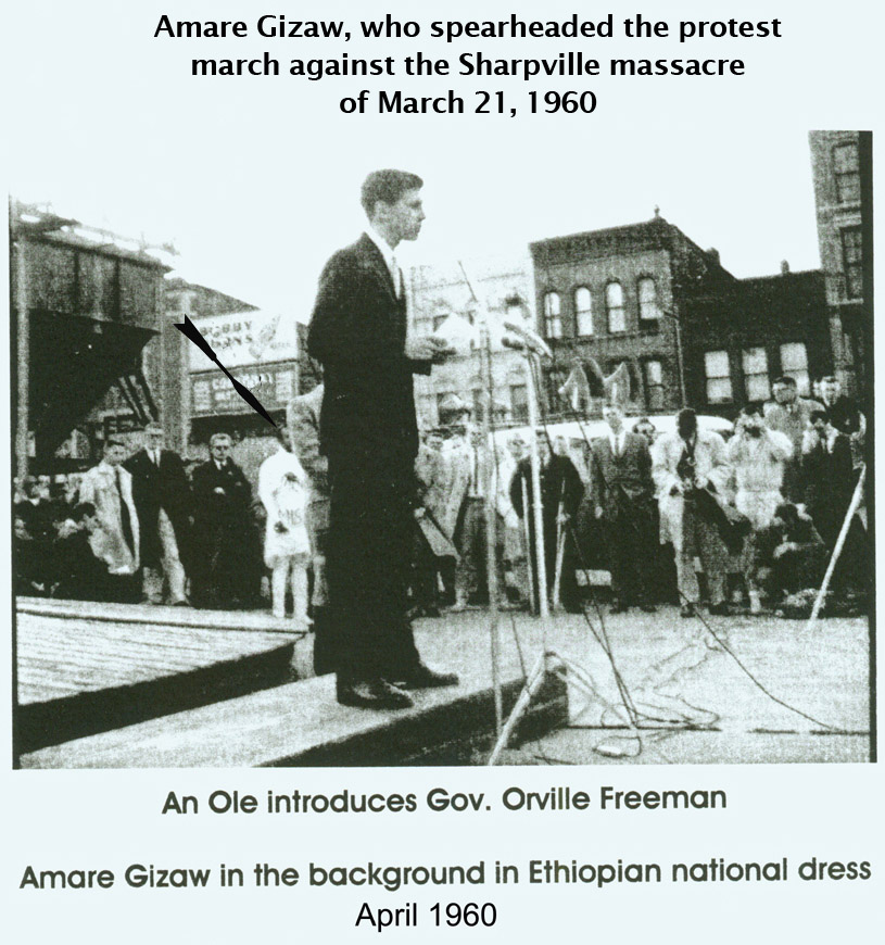 Amare Gizaw's heartrending story of decades of struggle, sacrifice, and personal denial is extraordinary. In the fall of 1956, Amare enrolled as a freshman at St. Olaf College, Northfield, Minnesota where he majored in political science and history. In 1954 Emperor Haile Selassie came to America as an official guest of President Eisenhower. After the White House ceremony he came to visit St. Olaf College, accompanied by the American Ambassador to Ethiopia, Joseph Simonson, an alumnus of the college. Dr. Granskou, the college president, offered the Emperor one scholarship which was won by Amare. After leaving Northfield in 1960 Amare enrolled as a graduate student at American University in Washington, DC. While in Washington he worked as manager of Africa House, of the African-American Institute, helped form the Ethiopian Student Association, worked with Sargent Shriver in the Kennedy Administration to help establish the Peace Corps, and met with President Kennedy in the Oval Office. He returned to Ethiopia in 1963, inspired by American democratic ideals and full of hope for improving the lives of his fellow Ethiopians. Amare's dream of transforming Ethiopia into an America-style democracy, however, was dashed as conditions deteriorated shortly after his return home. When famine struck Ethiopia's two northern provinces in 1973, Amare worked with western missionaries to provide food, medicine, and clothing to the needy. When the famine worsened, Amare sought help in London, arriving just as Jonathan Dimbleby of the BBC released the film that shockingly displayed to the world the horror of the Ethiopian famine. With Dimbleby, NGOs and friends of Ethiopia, Amare was again able to raise funds and ship food and medicine to Ethiopia. Following the coup in 1974, Amare returned to Ethiopia and was recruited for a senior position in the interim government. When Mengistu seized control his lieutenants murdered Haile Selassie and sixty government leaders and imprisoned hundreds of professional Ethiopians, Amare included. Amare's American friends tried to locate him at the time, but reports from the American embassy in Addis Ababa indicated that he had probably not survived the communist coup. But Amare did survive, and despite imprisonment and severe beatings he was finally released from prison and continued his mission to help his fellow Ethiopians, this time combating wide-spread degradation of the environment under the communists who, having confiscated ownership of private lands, left the forests and trees unprotected from people seeking free firewood for cooking. Conditions in Ethiopia deteriorated further, and in 2002 Amare finally escaped to the U.S., returning to his adopted land for the first time in nearly 40 years. Through decades of tragedy and disappointment, Amare maintained his Jeffersonian outlook and his St. Olaf idealism. Today he is a highly articulate spokesperson for Ethiopian freedom and democracy.