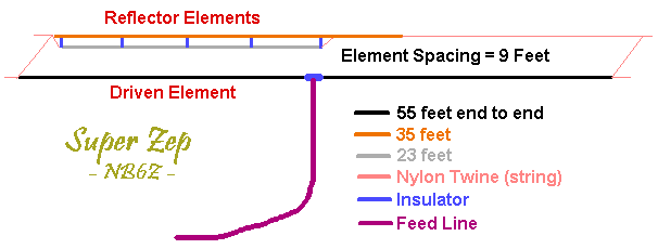 The driven element is a full sized 15 meter EDZep. A tuner (with balanced output) at the radio is used to match the feed line (open ladder or TV twin lead) from the center-fed wire. Drop the feed line down or away from the antenna at 90 degrees for as far as possible. Keep the feed line away from metal objects if possible. The line may be attached directly to the balanced line output posts of any tuner. CLICK for DETAIL If that is not possible, construct (or purchase) a 4:1 voltage balun and connect the step-up balanced side of the transformer to the twin lead and connect a short run of coax to the unbalanced side. (See construction notes on the NB6Zep antenna.) You connect the other end of the coax to the unbalanced output connector on the tuner. This technique is useful for bringing twin lead from the outside into the shack through a window or other entry. Make a loop at the balun transformer to keep rain out of the device. CLICK for DETAIL The antenna tunes up nicely on 10, 12, 15, 17 and 20 meters. On 10 and 12 meters the antenna has gain but does not function as a beam due to the multiple lobes for these frequencies. For these frequencies, the major lobes are not perpendicular to the wire and adding a reflector would not be practical. On 17 meters the antenna functions as a double zep antenna with gain broadside to the wire. (A reflector could have been added for 17 meters, put that's another project...) It is important to line-up the reflector wire ends with one end or the other of the driven wire (as shown).