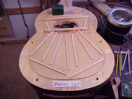 Braces cut ready to glue. IMPORTANT-- all glueing is done on the dished solera, rosette side down to create the domeing of the top.